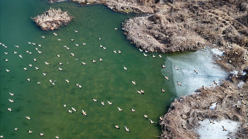 候鸟在黄河宁夏段一处湿地栖息、觅食(2025年2月26日摄,无人机照片)。新华社记者王鹏摄
